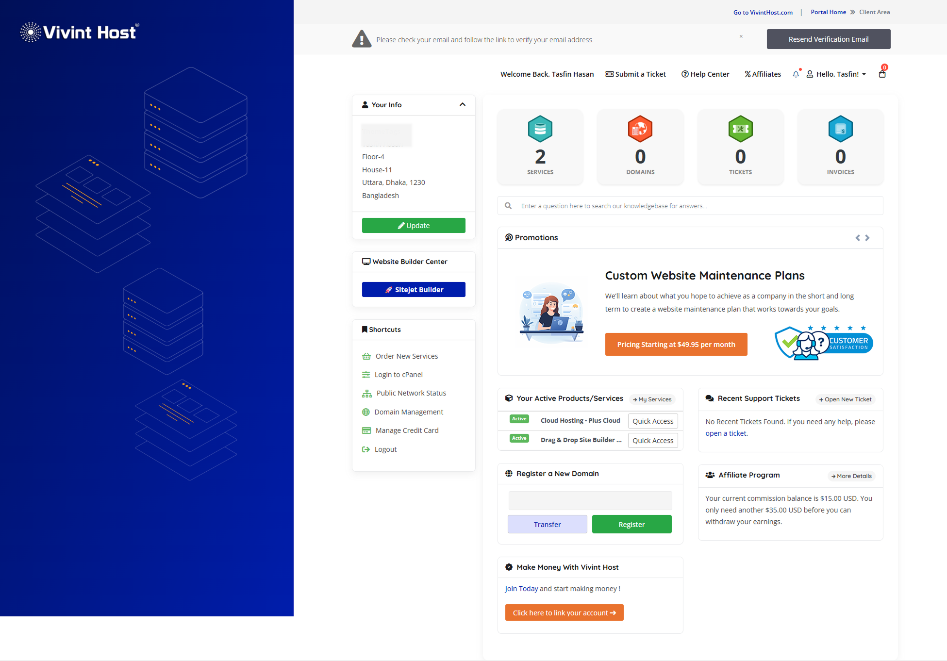 Your Vivint Host Customer Area is the central hub where you can manage your hosting plans, domain names, billing, and support tickets-all from one secure location.