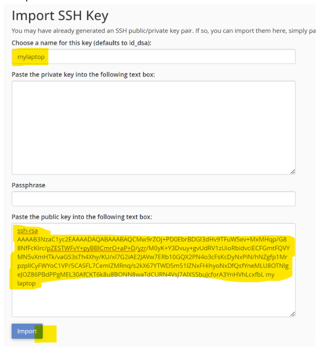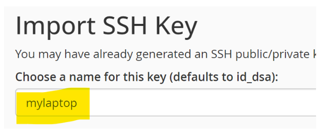 For the Key Name, you can leave it blank (it defaults to id_dsa), but it’s helpful to name it (e.g., mylaptop) if you plan to manage multiple keys.
