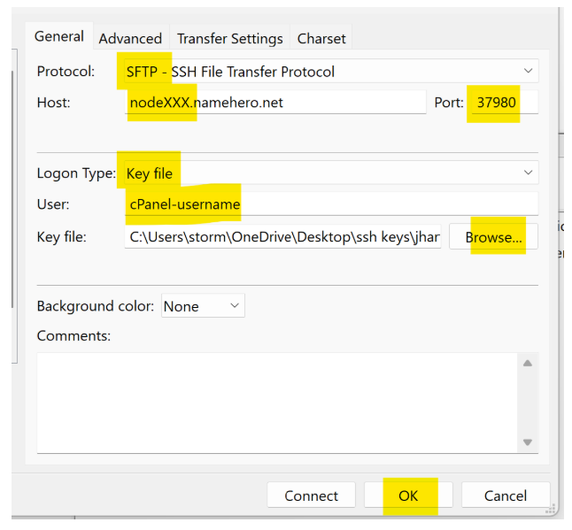 - Key File: Browse to the private key you saved earlier in Step 3.