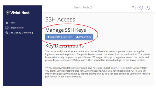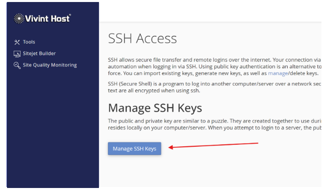 On the SSH Access page, click on “Manage SSH Keys”. This is where you can create or import key pairs.